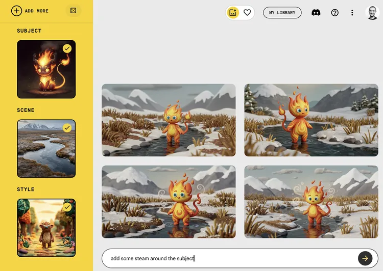 Whisk will then generate images and a text prompt for each image. You can favorite or download the image if you’re happy with the results, or you can refine an image by entering more text into the text box or clicking the image and editing the text prompt.